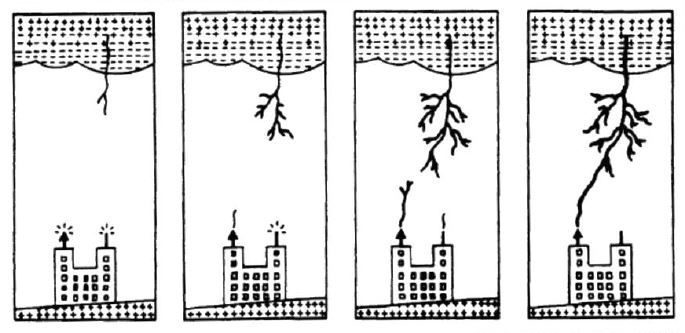 Empecemos por el hecho de que un rayo es consecuencia del aumento de campo eléctrico, que puede superar valores de kV/m en el suelo, iniciando así la creación de descargas corona. El rayo comienza por la formación de un trazador descendente que transporta cargas eléctricas, provocando así un incremento del campo eléctrico en el suelo. Es en este momento cuando un trazador ascendente se forma partir de una estructura u objeto sobre el suelo o sobre el edificio y se propaga hasta que se encuentra con el trazador descendente.