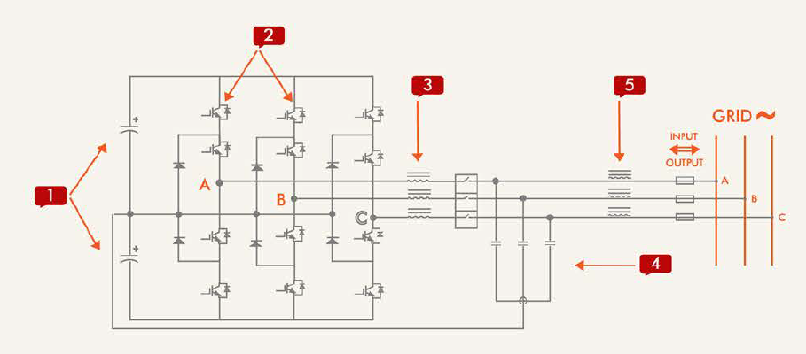 - Inductor de alta frecuencia (5): usado para el filtrado. La combinación del circuito de filtro LC y el inductor de alta frecuencia se denomina circuito de filtro LCL.