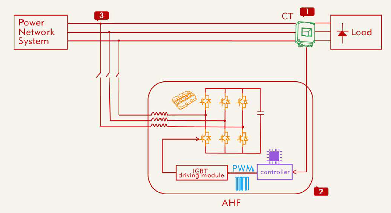 El CT (Transformador de corriente) externo detecta la corriente de carga, el DSP como CPU tiene una aritmética de control lógico avanzada, la cual rastrea rápidamente la corriente de instrucción, divide la corriente de carga en potencia activa y potencia reactiva mediante el uso de una FFT (Transformada rápida de Fourier) inteligente y calcula el contenido armónico de forma rápida y precisa.