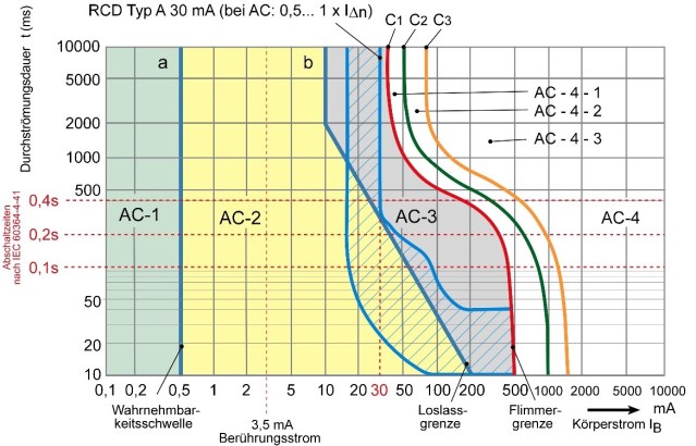 Es precisamente en base a estos tiempos que están limitados los dispositivos de protección contra sobrecorriente y los dispositivos de corriente residual (RCD), no el amperaje. El tipo de dispositivo de protección de corriente residual a usar dependerá del tipo de corriente de falla que se espere.