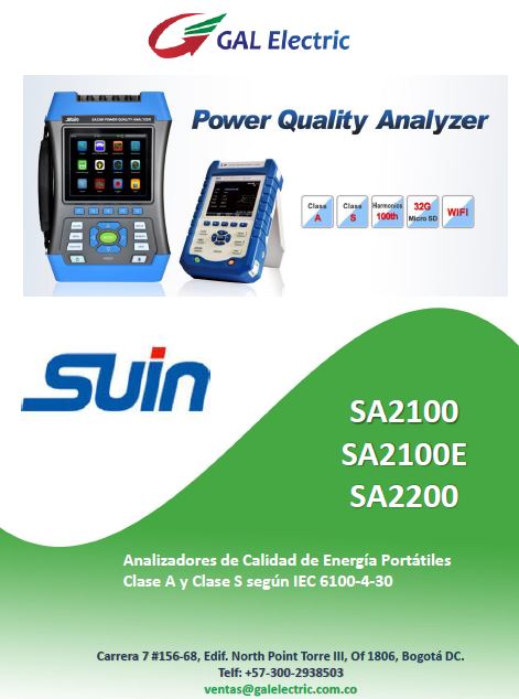 La Serie SA de Analizadores portátiles de calidad de energía eléctrica de SUIN se componen de equipos CLASE A (SA2200) y Clase S (SA2100/2100E). Son equipos portátiles para uso profesional que miden parámetros eléctricos y de calidad de energía, armónicos en cada fase y neutro, interarmónicos, distorsiones eléctricas, como caídas y picos de tensión (sags, swells), transitorios, fickers. Mediciones hasta 3000 Amp, con pinzas flexibles amperimétricas incluidas, pero que pueden elegirse de acuerdo al requerimiento.