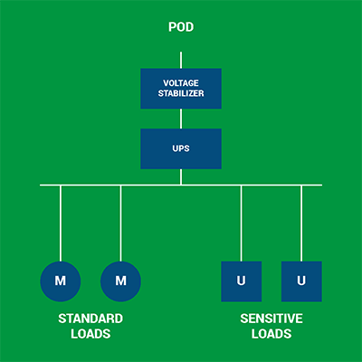 En este caso, el estabilizador lleva la calidad de energía general del sistema a un buen nivel, preservando las baterías del UPS periférico individual que está “cuidando” cargas particularmente sensibles.